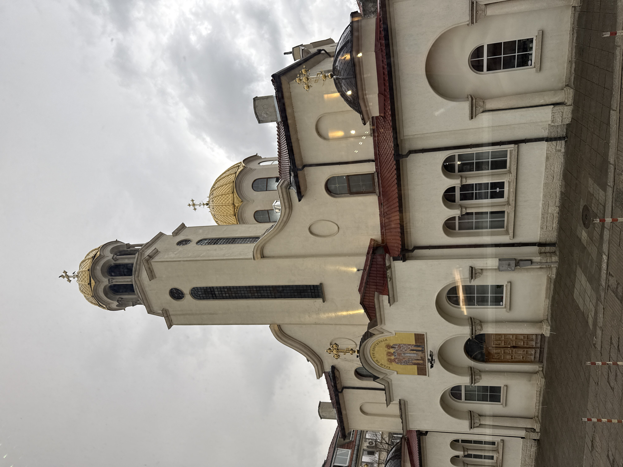 The image displays the Church of the Holy Three Hierarchs (Църква "Св. Три Светители") in Shumen, Bulgaria, under an overcast sky. The church features a light cream-colored stucco facade with multiple architectural elements. A central bell tower rises prominently, topped with a golden onion dome and an Orthodox cross. A larger golden onion dome with a cross is visible behind and to the right of the bell tower, constituting the main dome of the church. A smaller, dark, semi-spherical dome with a golden cross is situated on the lower right side of the structure. The roof sections are covered with red tiles. The main entrance, centered on the lower facade, consists of a double wooden door with carved panels, recessed within a large arched opening flanked by decorative columns. Above this entrance, within an arched pediment, is a Byzantine-style mosaic depicting three robed male figures. Below the mosaic, Cyrillic text, reading "Св. Три Светители" (St. Three Saints), is visible. Golden Orthodox crosses are affixed to the facade above the mosaic and on the domes. The church's exterior incorporates numerous arched windows with white frames and dark glazing. Some sections of the facade are illuminated by wall-mounted spotlights. The building's base features a textured stone appearance. To the immediate right of the main entrance, a grey utility box is mounted on the wall. The ground in front of the church is paved with concrete pavers or flagstones. In the lower foreground, red and white striped bollards are visible. Portions of adjacent residential buildings with traditional roofs are observable in the background to the left. No individuals or active events are depicted.