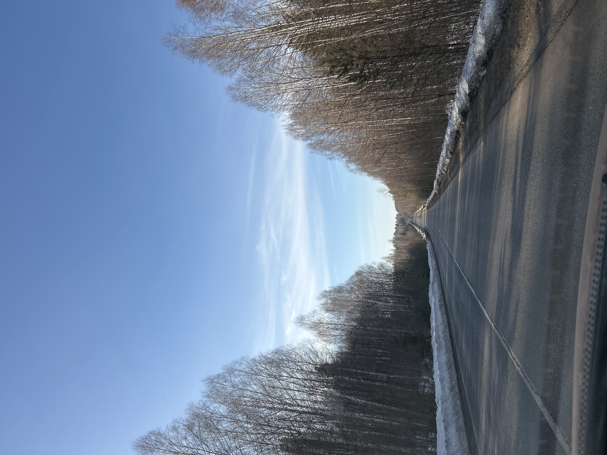 A paved road, likely a highway, stretches into the distance under a clear blue sky with thin, wispy clouds. The road is flanked on both sides by dense forests of bare trees, their branches silhouetted against the sky. Patches of snow are visible along the road's edges, particularly near a guardrail. The perspective suggests the image was taken from inside a vehicle moving along the road. This is in Уральское, Russia.