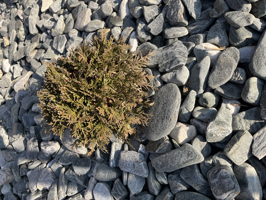 - "The scene depicts a small, spherical shrub planted within a ground cover of irregularly shaped, smooth grey and dark grey stones and pebbles, illuminated by direct sunlight" by FM-yO5cv1, licensed under CC BY 4.0