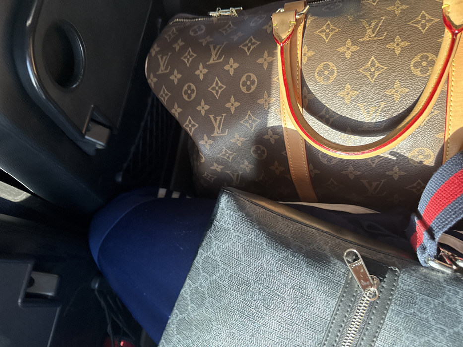 The scene depicts the interior of a vehicle during daylight, focusing on the contents of the rear passenger or cargo area. A person's upper left thigh, clothed in dark blue athletic pants with a white stripe near the knee, is visible in the upper left. Adjacent to the leg, on the left, is a rectangular gray-black bag featuring a patterned texture and a silver-toned zipper pull. To the right of the person's leg and the gray-black bag is a large brown travel bag with a distinctive pattern of interlocking "LV" monograms and floral motifs, characteristic of Louis Vuitton. This bag has light tan leather trim and handles with bright red edges. A strap with red and blue stripes is partially visible at the bottom center, possibly belonging to one of the bags or another item. The vehicle's interior features dark upholstery or plastic, with an overhead handle and a dark mesh pocket visible in the background. Overhead, a black fold-down tray with a circular indentation, possibly a cup holder, is partially visible. Natural light illuminates the objects, casting distinct shadows. No specific identifying markers for Pokrovskoye, Russia are visually present within the image; the environment is confined to the vehicle interior.