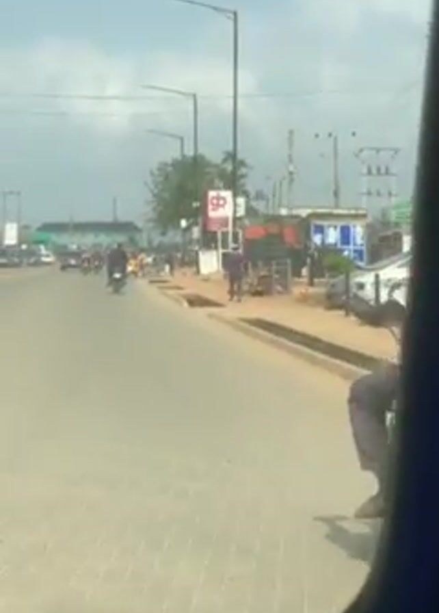 The video, shot from a moving vehicle, captures a scene on a wide, brick-paved road in what appears to be a bustling urban area