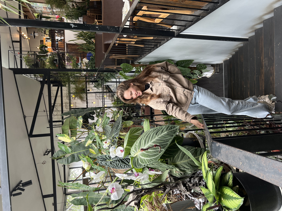 A young woman in a beige jacket and light blue jeans is standing indoors, amidst a lush collection of potted plants, including orchids