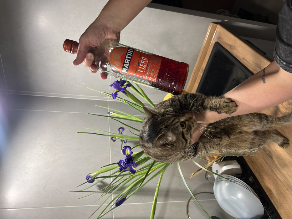 The scene is located in a kitchen in Simferopol, Ukraine. A light gray tiled wall forms the background, above a light-colored wooden countertop. A black rectangular sink is partially visible on the right side of the countertop. A green plant with several purple iris flowers and buds is situated on the left side of the countertop. A person's left hand and forearm, featuring a small dark tattoo on the forearm, is supporting a brown tabby cat with black stripes. The cat is suspended above the countertop, looking down and to its right. Simultaneously, a person's right hand is holding a clear glass bottle containing a reddish-orange liquid, positioned to the right of the cat. The bottle has an orange screw cap and its label identifies it as 'MARTINI FIERO L'APERITIVO'.