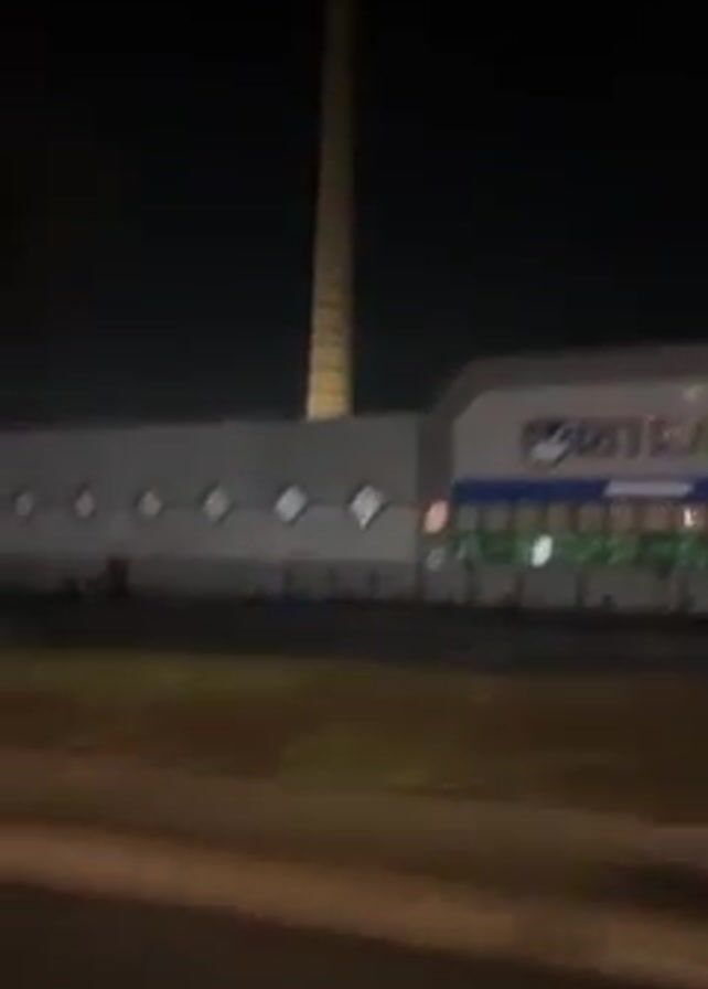 At night, the camera travels past a Rite Aid store with a very tall, lighted smokestack behind it. The camera is moving on what appears to be a road.