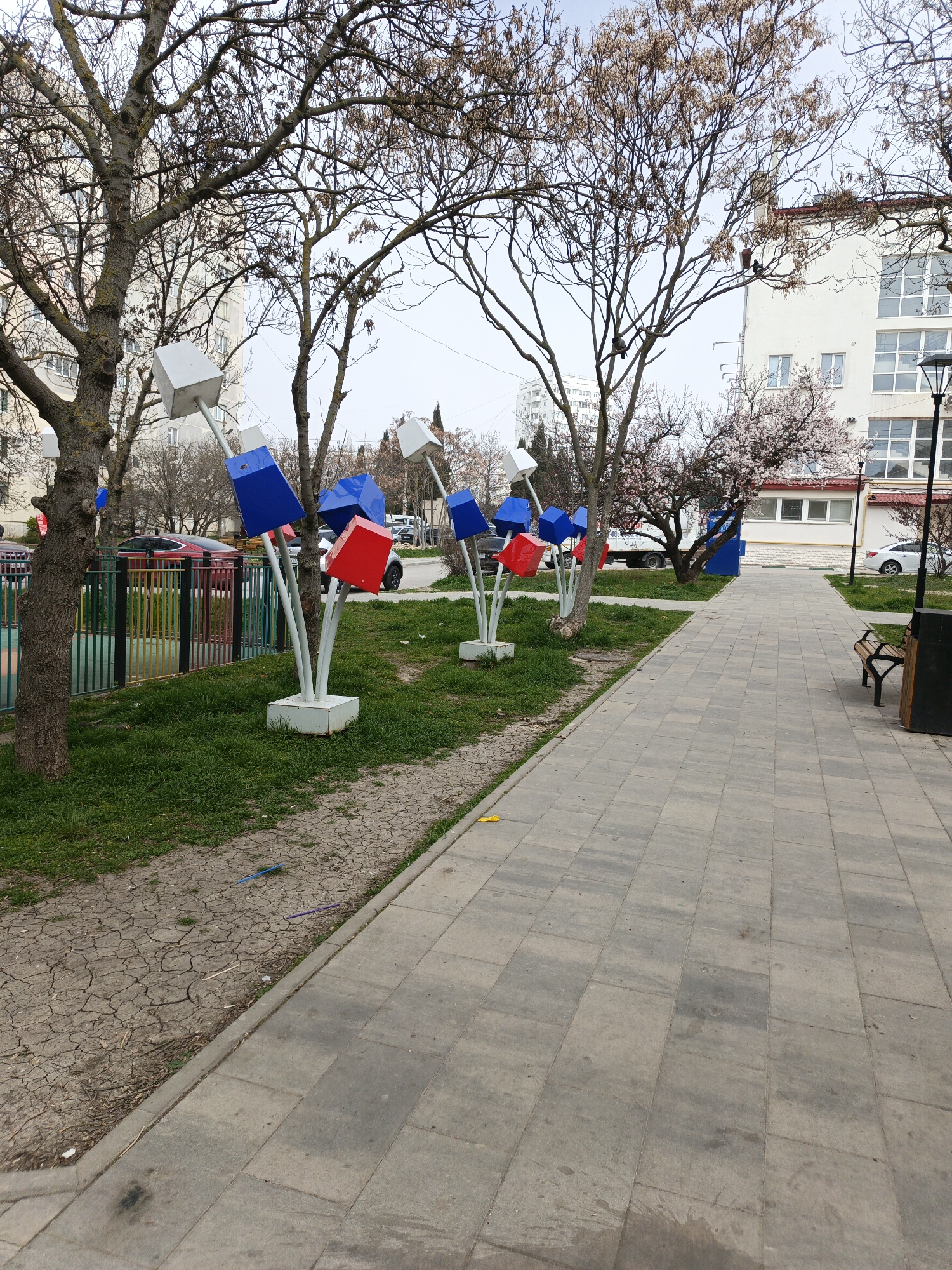 This image displays an outdoor urban scene in Sevastopol, Ukraine, characterized by a paved pedestrian walkway bordered by a grassy median. The walkway is constructed from rectangular grey pavers, exhibiting minor surface discoloration and scattered small pieces of debris, including yellow, blue, and purple fragments. In the grassy median to the left of the walkway, four abstract sculptures are positioned. Each sculpture features white metal stems supporting a cluster of cubic elements in white, blue, and red colors. The grass itself is varied, with patches of green intermingling with areas of dry, cracked earth, particularly along the edge of the walkway. Beyond the sculptures and grass, a multi-colored metal fence with vertical bars (green, red, yellow, blue sections) encloses an area, likely a playground. Several parked vehicles, including a red car, are partially visible behind this fence and trees. To the right of the paved walkway, a wooden bench with dark metal arms and a black cylindrical waste bin are situated. Further right, a black lamppost is visible. The background consists of multi-story buildings, predominantly light-colored with numerous windows, suggesting residential or commercial structures. Multiple deciduous trees with largely bare branches are distributed throughout the scene, with one tree near the building on the right displaying pink blossoms. The sky is uniformly light and overcast. No individuals are present within the frame.