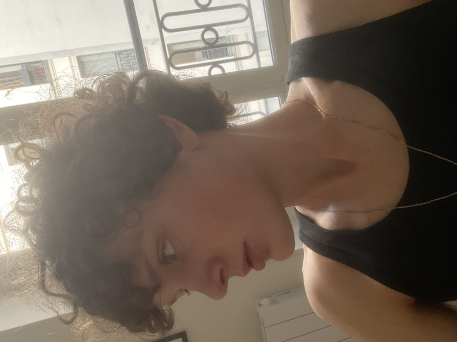 An individual with short, curly, brown hair and fair skin is depicted in a profile view from the chest up, looking leftward. They are wearing a black tank top and a thin gold-colored chain necklace. The scene is illuminated by natural light entering from a window on the right side, casting a bright highlight on the subject's hair. To the immediate left of the subject, a white radiator and a partially visible framed item are present on an interior wall. Through the window, the exterior reveals characteristic Haussmannian architecture of Paris, France, consisting of light-colored stone buildings with numerous windows and decorative black wrought-iron balconies featuring circular and curved patterns. Another similar building is visible in the background, suggesting an urban street or courtyard setting.