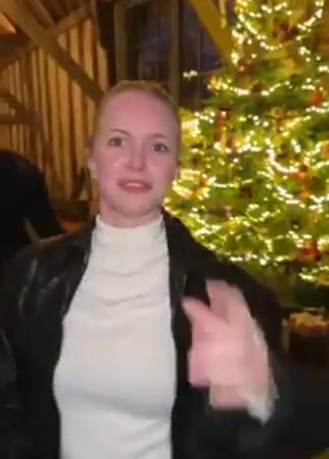 The video captures a woman in a festive setting. She is indoors, standing near a Christmas tree decorated with lights. The woman wears a white turtleneck sweater and a black leather jacket. Her blonde hair is pulled back in a ponytail. She speaks to the camera. The setting appears to be a room with wooden beams and decorative lighting.