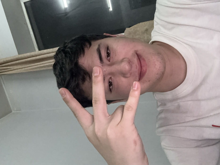 A light-skinned person poses for a selfie indoors. The person wears a white T-shirt. The background includes a window with curtains. The person makes a hand gesture with their fingers. The person has short dark hair and dark eyes.