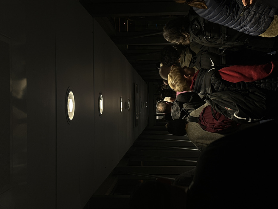 - "The image depicts a dense line of approximately twenty individuals moving through a dimly lit indoor corridor, consistent with an airport jet bridge or terminal walkway at Nice Côte d'Azur Airport, Nice, France" by FM-SDjC03, licensed under CC BY 4.0