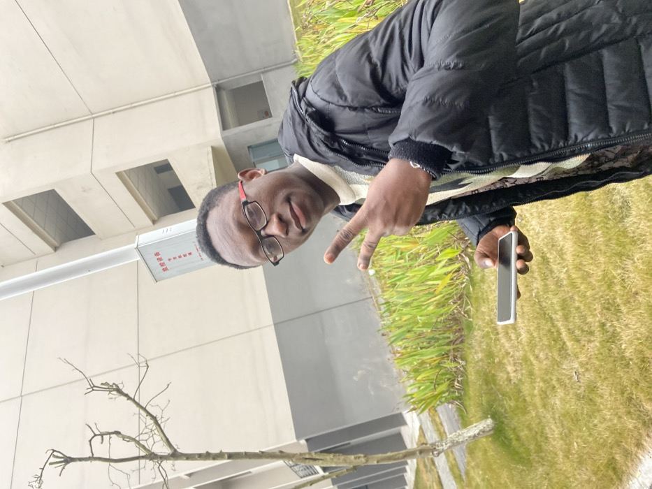 A person with glasses and a black jacket makes a peace sign while holding a smartphone. The background includes a building with visible windows, a grassy area, and a small tree. The person is outside on what appears to be a sunny day, and the image is rotated.
