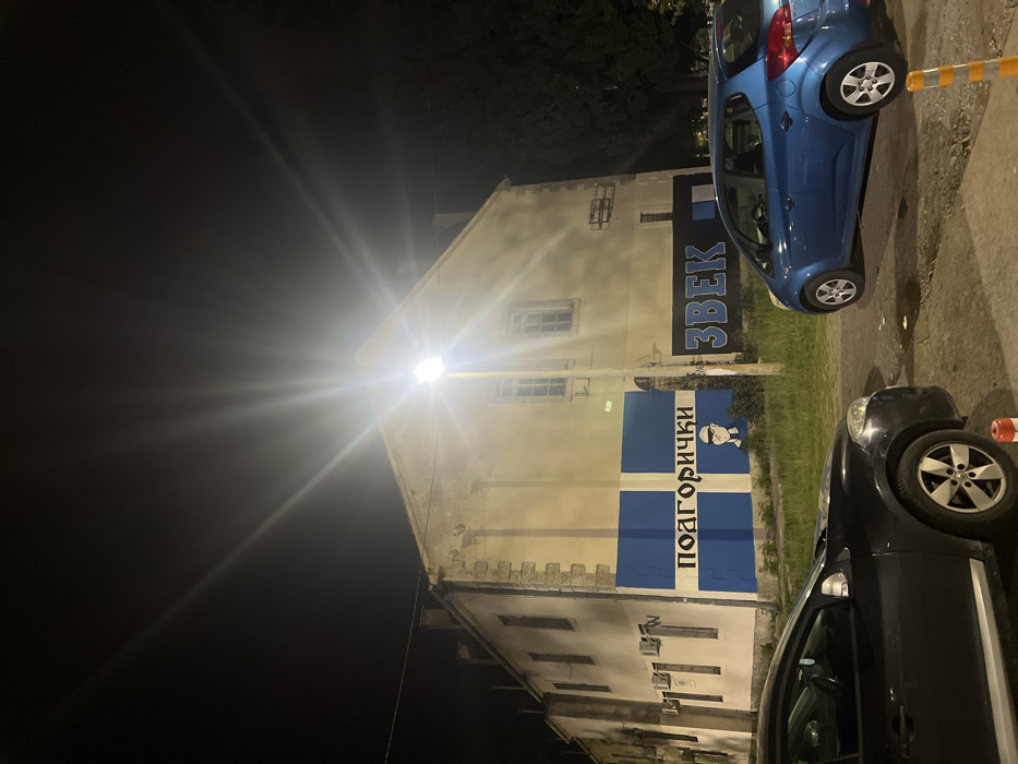A nighttime photograph shows the facade of a two-story, light-colored building in Podgorica, Montenegro. A prominent street light, located centrally in the foreground, emits bright white light with visible lens flares, illuminating the building. The lower portion of the building's facade features two distinct graffiti murals: on the left, a blue field with a white cross, displaying the Cyrillic text "ПОДГОРИЧКИ" (Podgorički) above a stylized cartoon head wearing sunglasses and a cap; on the right, a dark blue section with large white Cyrillic text "ЗВЕК". Multiple air conditioning units are mounted on the lower left side of the building. Two vehicles are partially visible, parked on an asphalt surface in the foreground: a black sedan on the left and a blue hatchback on the right. A small area of overgrown vegetation lies between the parked vehicles and the building. The sky is dark, indicating night, with trees visible in the dark background on the far right. No individuals are present in the scene.