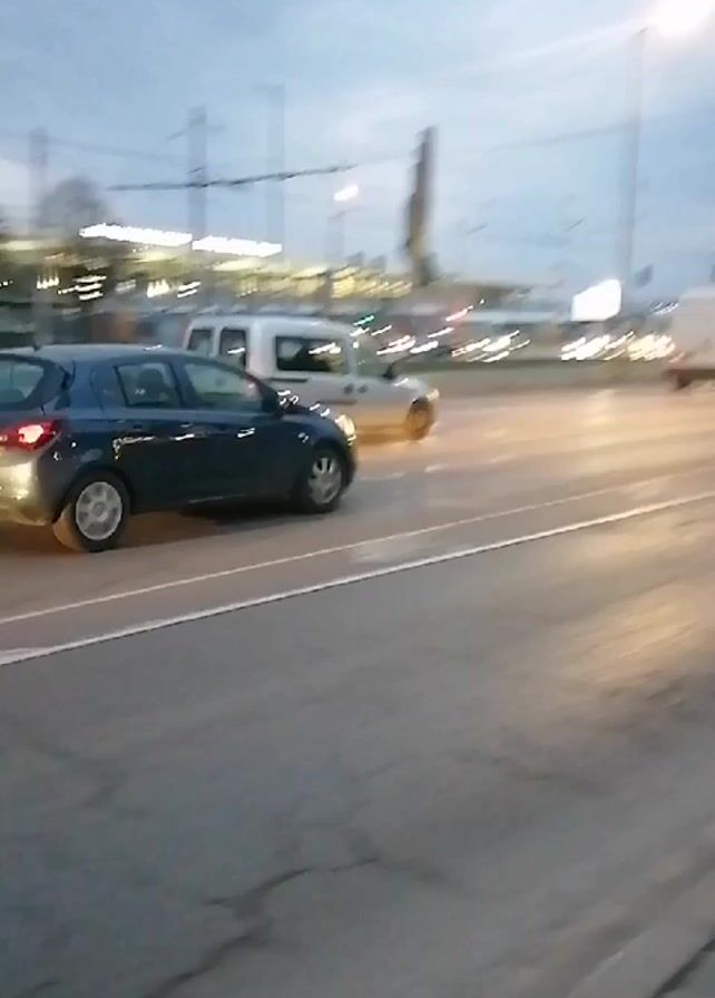 The video, shot at eye-level, shows a street scene with vehicular traffic. It appears to be dusk or dawn, under a pale sky. Various vehicles, including cars and vans, are moving on the multi-lane road. A blue hatchback is visible in the foreground at the beginning, followed by other cars, including a silver sedan, passing by. In the background, there's a building illuminated with lights, along with street lights and traffic signals. There are also poles possibly supporting overhead wires. The road surface is asphalt, with some visible cracks and line markings. The focus and quality of the video is low, with some camera shake.
