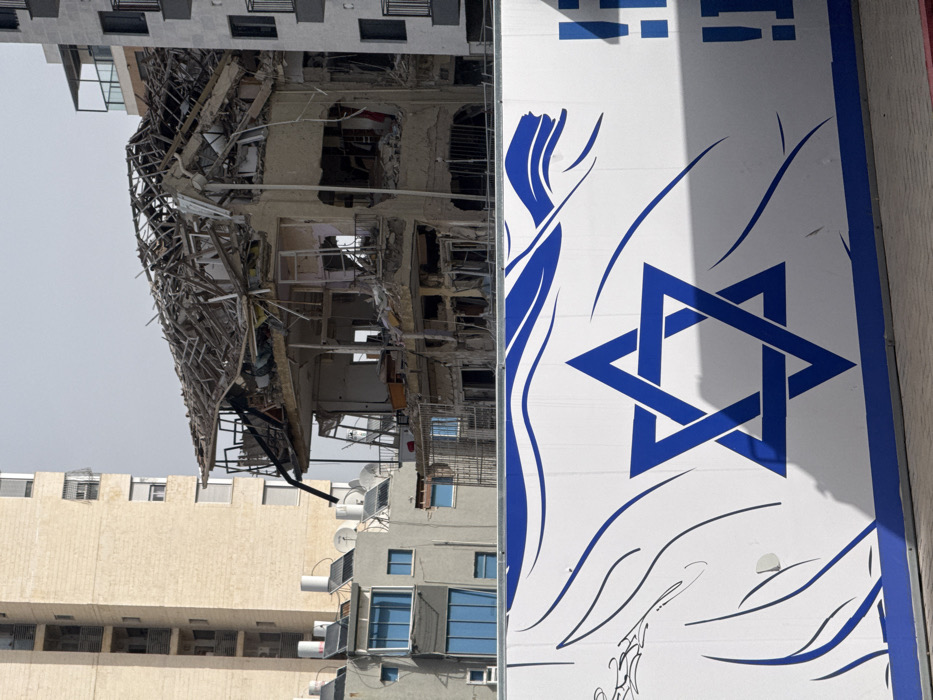 The image depicts an urban scene in Bat Yam, Israel, focusing on a severely damaged multi-story building viewed from behind a construction barrier