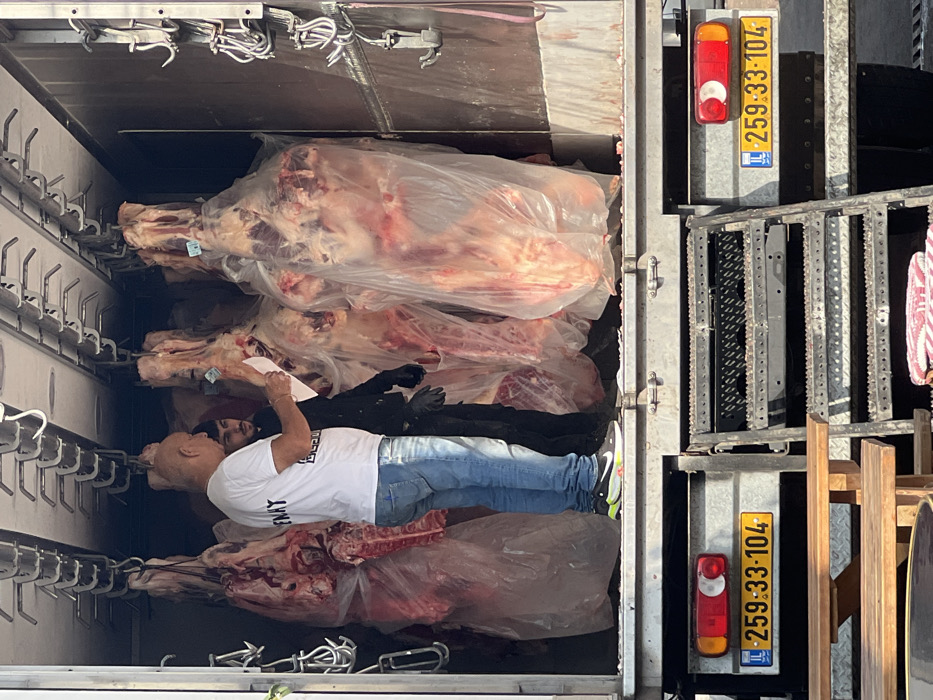 open back of a refrigerated truck filled with several large, plastic-wrapped carcasses of meat