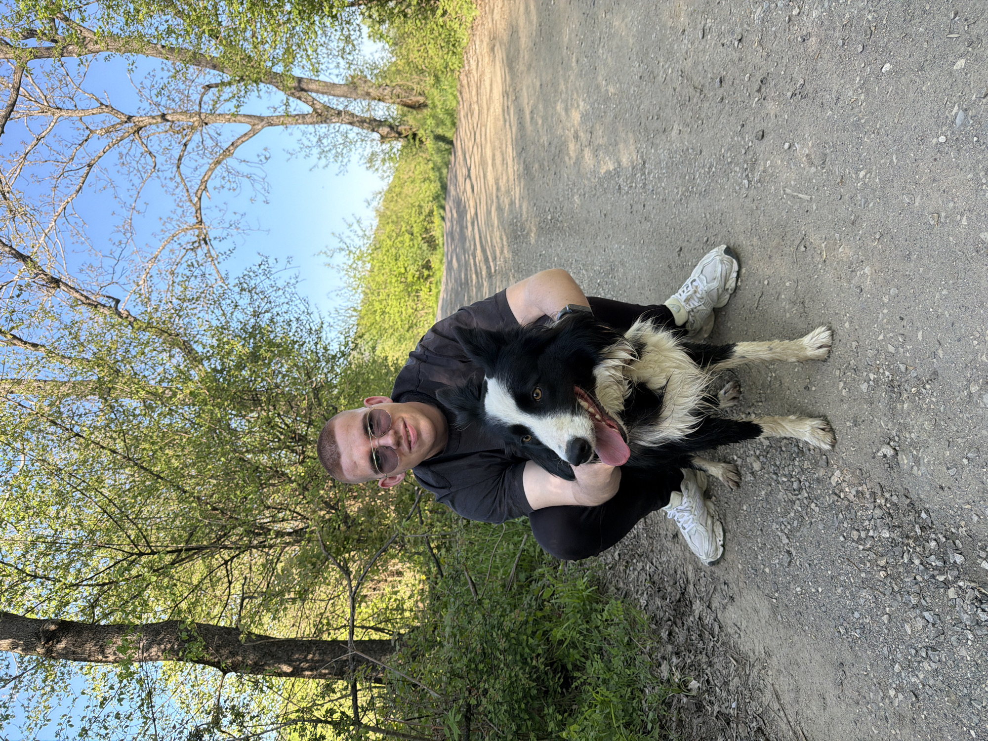 A man is squatting down on a gravel path, hugging a black and white dog. The man is wearing sunglasses and dark clothing, while the dog has its tongue hanging out. They are on a path surrounded by trees and greenery, with a glimpse of blue sky visible through the branches. The location appears to be outdoors, possibly in a park or wooded area near Berkovitsa, Bulgaria.