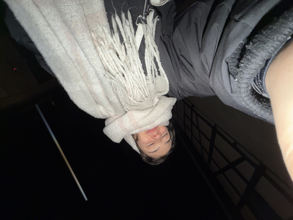 A selfie is oriented upside down, showing a person wearing a light-colored scarf and a dark jacket. The scarf is wrapped around the head and neck. A strap of some sort hangs from the person's clothing. In the dark background, a long, slender object is visible, emitting a faint glow. A railing is also visible behind the person. The person's eyes are closed.