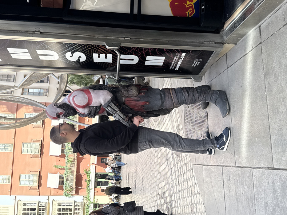 An outdoor scene in Málaga, Spain, depicts two male figures standing face-to-face on a city sidewalk. The location is identifiable by the "MUSEUM" sign on the right, displaying "ENTRADAS A LA VENTA EN OXOMUSEO.COM", indicating the OXO Museo del Videojuego de Málaga, likely on Calle Carcer. On the left, a man with short dark hair, glasses, wearing a black hooded sweatshirt, grey jeans, and dark blue sneakers, stands with his hands clasped in front. He is looking directly at the figure opposite him. To his right, a large, muscular figure, resembling the character Kratos from the "God of War" video game series, stands with pale skin, red tribal markings, a dark beard, and dressed in dark grey and red tattered clothing with arm armor and wrapped boots. This figure, likely a detailed statue or costume, also appears to be looking directly at the man. Its arms are held down, hands seemingly clasped. The two figures are positioned very close, almost touching, suggesting a posed interaction or photographic opportunity. Behind the figures, a modern, metallic, curvilinear sculpture is visible. To the right, the entrance to the museum features a glass door with a vertical "MUSEUM" sign and a Red Bull logo sticker below. The ground is paved with patterned cobblestones transitioning to grey concrete slabs. In the background, a multi-story building with reddish-orange walls, white window frames, and balconies adorned with green foliage is prominent. Other distant buildings and several pedestrians populate the bustling street, with outdoor cafe seating visible further back under natural daylight.