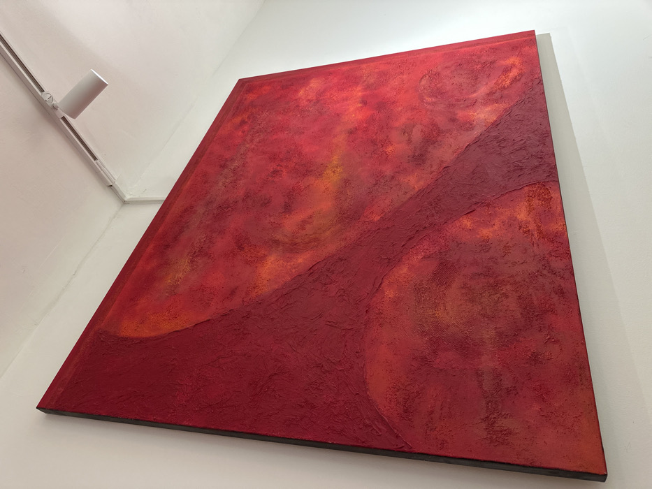 A large, rectangular abstract painting is mounted on a plain white wall in an art gallery setting in Tel Aviv, Israel. The artwork is predominantly crimson and deep red, with interspersed areas of vibrant orange and yellow hues. The canvas exhibits significant textural variation, characterized by thick impasto, visible ridges, and an uneven surface. A prominent, darker red diagonal band with pronounced texture extends from the upper left quadrant towards the lower right. Curved, arc-like forms, defined by subtle shifts in texture and color saturation, are discernible, particularly in the lower left portion of the painting. A white track light fixture, equipped with a single cylindrical spotlight, is affixed to the white ceiling, aimed to illuminate the artwork. The image is captured from a slightly low, oblique perspective, highlighting the painting's scale and tactile qualities. No people or further objects are visible in the scene.