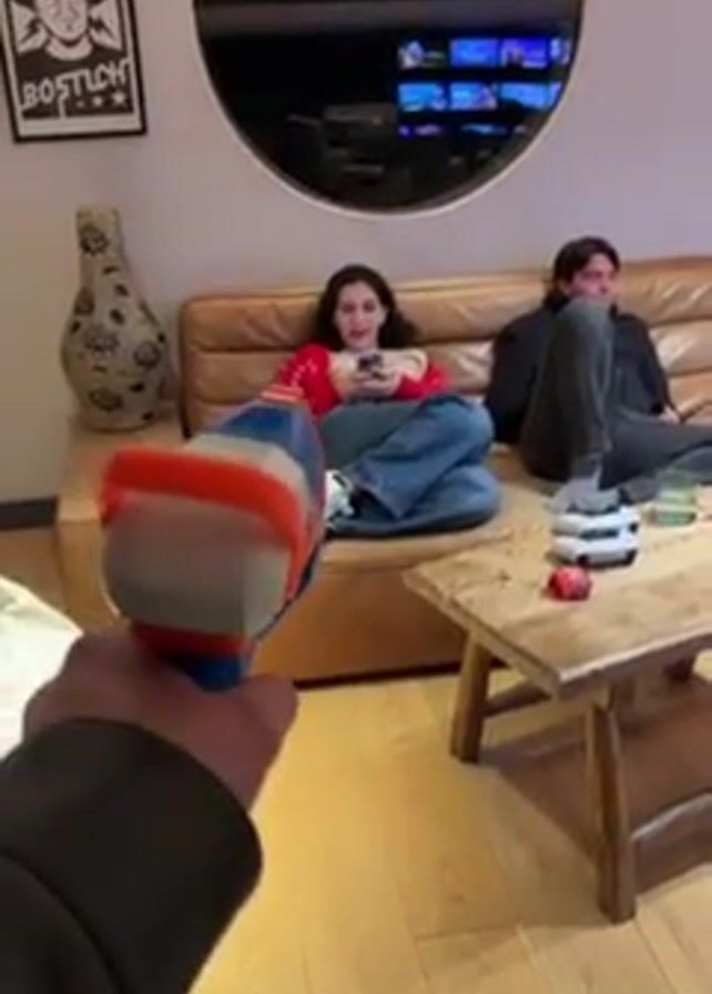 A first-person perspective shows a person holding a blue and orange toy gun in a living room-like setting. Two other people are lounging on a leather couch in the background. The person holding the gun shoots it at the person on the couch, who is looking at a phone. There is a wooden coffee table, a beanbag chair, a decorative vase, and a framed poster on the walls. A circular mirror behind the couch reflects a wall with multiple screens. The floor is hardwood.