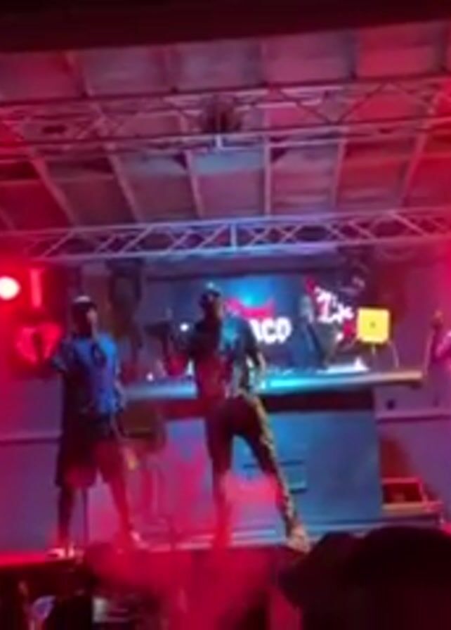 A video shows a group of five men dancing on an outdoor stage under red and blue lighting