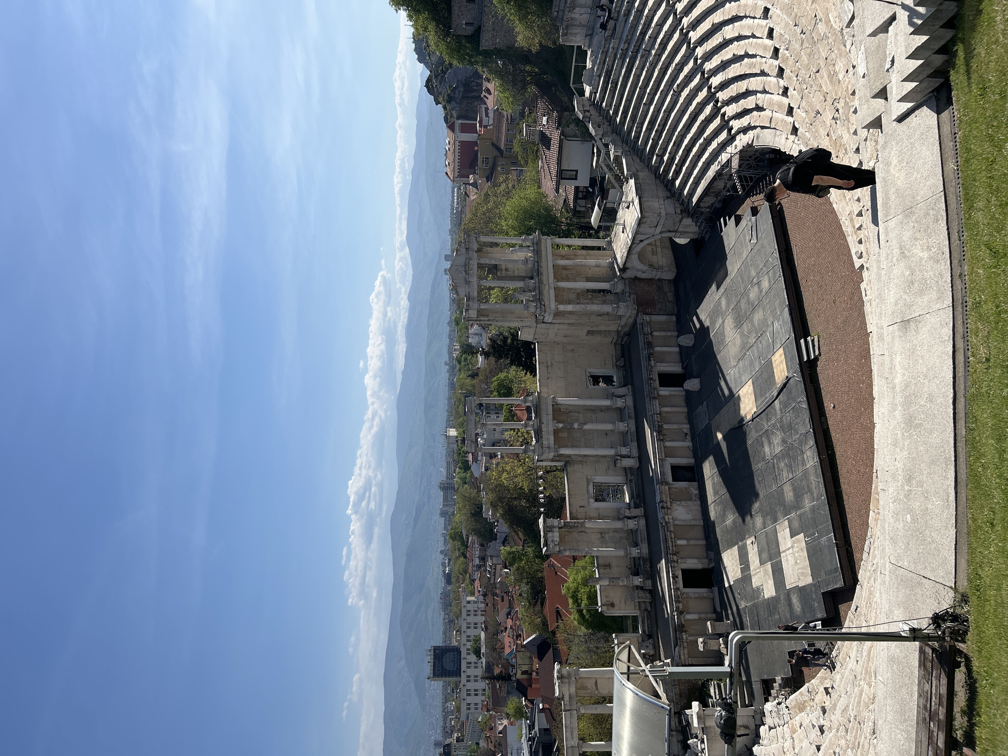 A high-angle, vertical, outdoor daytime shot depicts the Ancient Theatre of Philippopolis in Plovdiv, Bulgaria, set against a backdrop of a cityscape and distant mountains under a clear blue sky with scattered clouds. The Roman theatre's tiered seating is prominently featured on the right, constructed of light-colored stone. A person in dark clothing is visible on the stage of the theatre, although the detail is limited. The theatre's facade with pillars and arches is in the center of the image, showing signs of aging and reconstruction. Beyond the theatre lies the city of Plovdiv, with buildings, rooftops, and greenery. In the far distance, mountains fade into the horizon. The sky occupies the left side of the frame, exhibiting a gradient from light to darker blue with wispy clouds. Modern metal infrastructure and what appears to be a temporary structure are visible in the foreground.