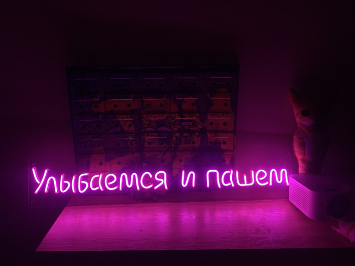 A neon sign reading "Улыбаемся и пашем" ("We smile and work") in pink illuminates a shelf