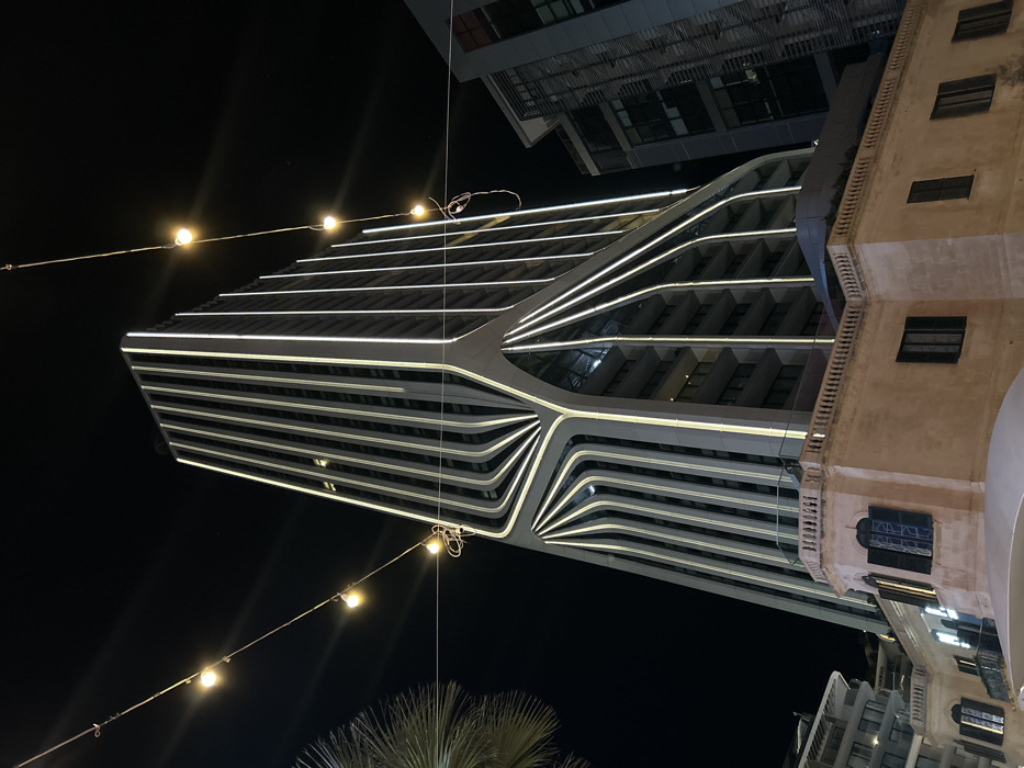 A striking nighttime view showcases a modern building illuminated with horizontal lines of light, its unique design curving inward towards the middle. Adjacent to it is a more traditional structure with a beige facade and rectangular windows. String lights hang diagonally across the scene, adding to the nighttime ambiance. The composition is shot from a low angle, with dark sky filling the negative space. A palm tree is at the bottom of the frame.