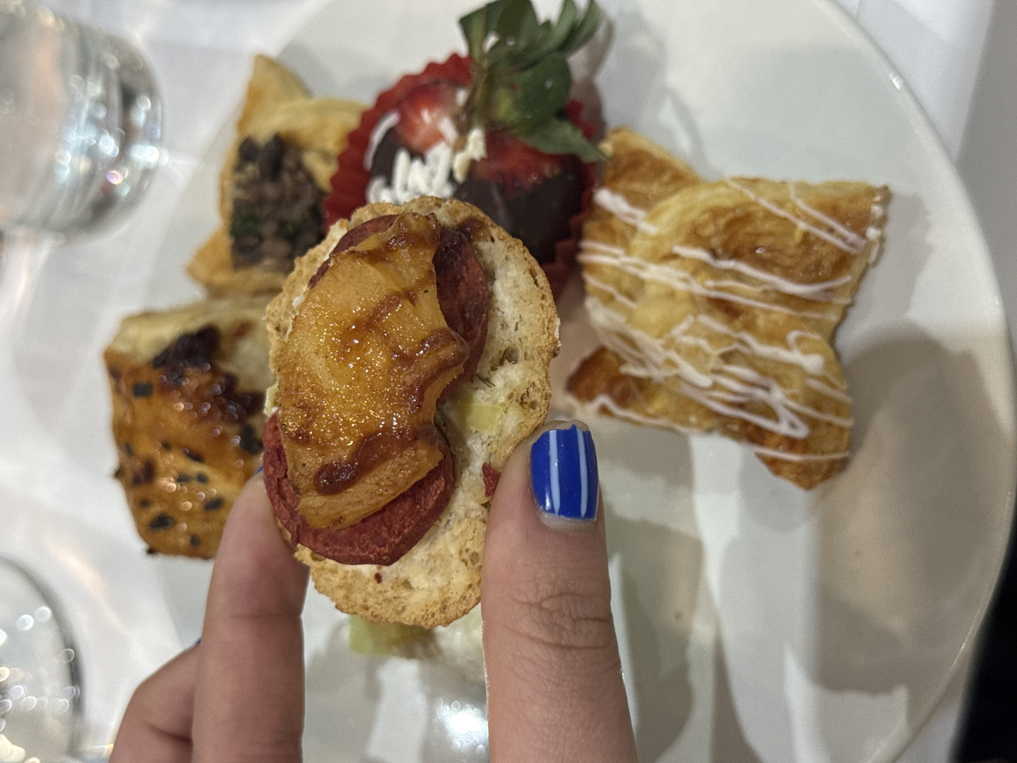 The image depicts an indoor scene in Ciudad López Mateos, Mexico, featuring a collection of small food items on a white plate. A human hand, with a fingernail painted blue with two horizontal white stripes, is centrally positioned, holding a single round appetizer. This appetizer consists of a toasted bread base, topped with two slices of a reddish, cylindrical meat product, and a segment of caramelized golden-brown fruit. On the white plate, several other distinct food items are visible: 1. A golden-brown pastry with scattered dark specks, located in the upper-middle background. 2. A roughly triangular pastry with a dark, textured filling, situated behind the held appetizer. 3. A chocolate-dipped strawberry with white sprinkles, nestled in a red fluted paper cup, positioned to the right of the held appetizer. 4. A flaky golden-brown pastry, drizzled with white icing in a crisscross pattern, located in the lower-right foreground. In the upper-right background, a clear drinking glass is partially visible and out of focus. The food items rest on a white surface, consistent with a tablecloth or table.