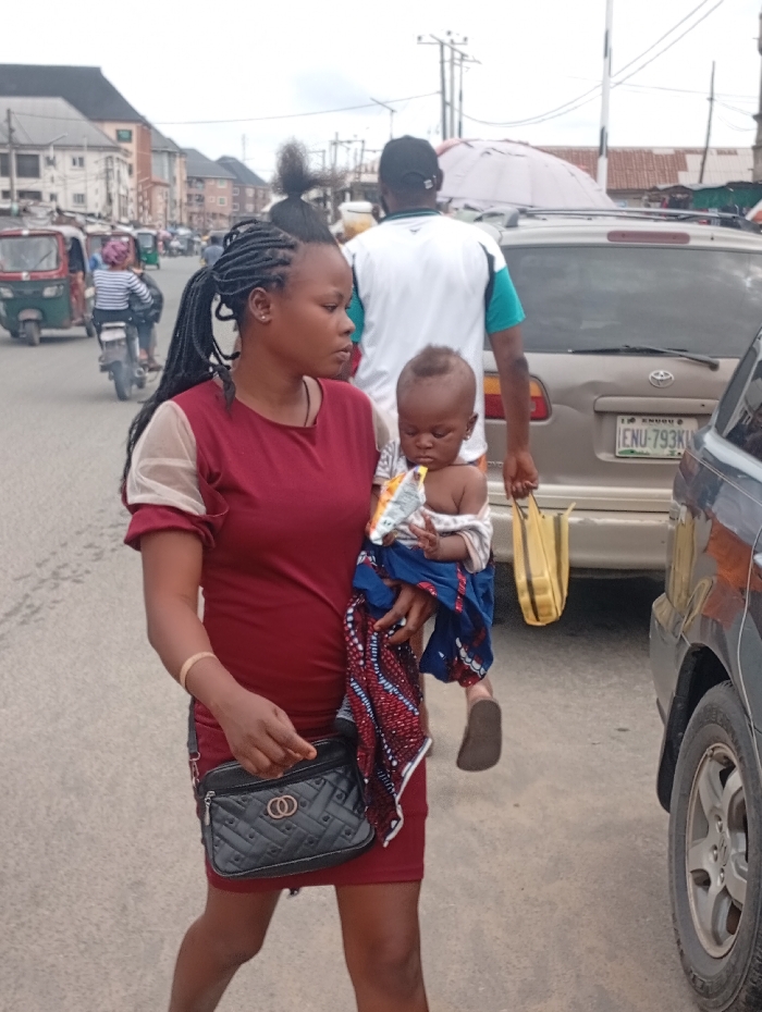 The image displays a daytime urban street scene in Ura Nta Umuarandu, Nigeria. In the foreground, an adult female with dark braided hair, wearing a dark red dress with sheer sleeves and a light-colored bracelet on her left wrist, walks towards the right. She carries an infant on her left side, who is dressed in a light-colored top and patterned blue, red, and white fabric, and holds a yellow and white packet to its mouth. The infant has light-colored, upward-styled hair. The woman carries a black quilted shoulder bag with a gold clasp. Behind the woman and child, an adult male is observed from the back, wearing a white shirt with a green panel, a dark baseball cap reversed, and carrying a yellow plastic bag in his right hand. To the right of the man, a gold-colored Toyota SUV with Nigerian license plate "ENU-793KW" is visible, displaying a dent on its rear passenger side. A dark-colored vehicle is partially visible on the extreme right in the foreground. In the background to the left, a red Bajaj Keke (tricycle) and a white motorcycle are present, with other indistinct figures and multi-story buildings lining the street under an overcast sky. Utility poles and power lines crisscross overhead.
