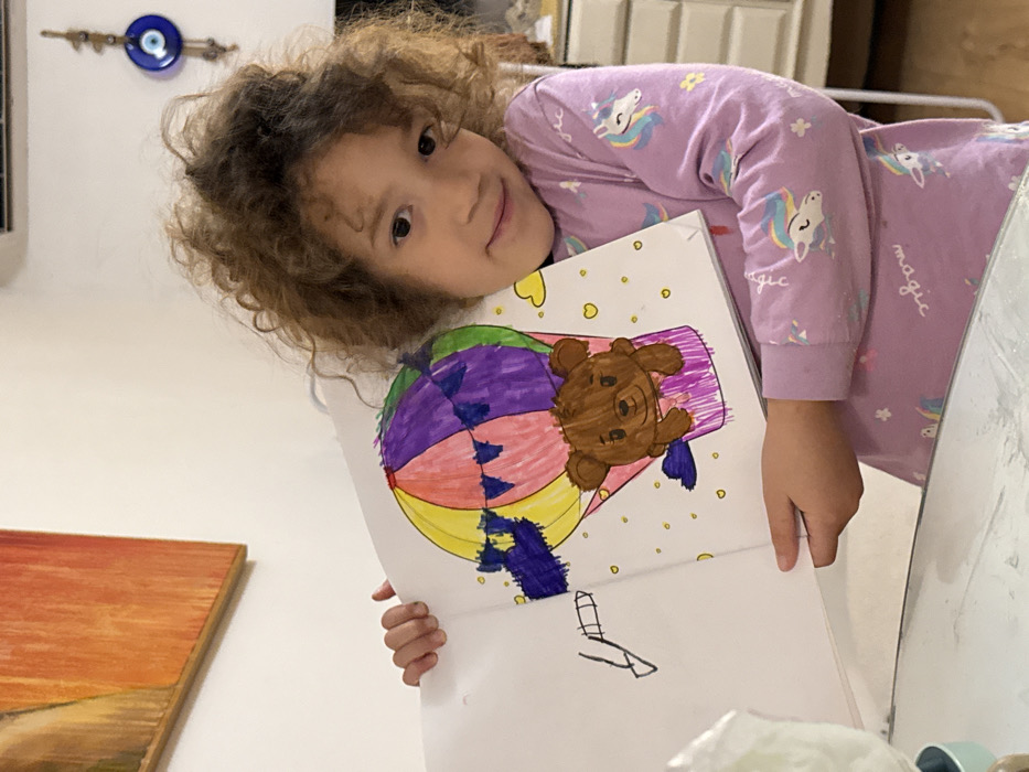 An image captures a young individual, likely a female child, standing indoors within a structure located in Budva, Montenegro. The child possesses curly brown hair and is attired in a light purple long-sleeved shirt patterned with unicorns and flowers. The child's hands support an open coloring book, presented towards the viewer. The right page of the book displays a completed marker drawing of a brown teddy bear situated within a multi-colored hot air balloon (yellow, pink, purple, green with blue bunting), surrounded by small yellow heart and circle motifs. The left page contains a partial black outline drawing. The child's gaze is directed forward, with a slight upturn at the corners of the mouth. The background consists of a white wall. Mounted on the wall are a framed orange-toned artwork on the left and a blue evil eye amulet on the right. An air conditioning unit is visible high on the wall. A light-colored cabinet or chest of drawers is partially visible on the far right. A reflective tabletop occupies the lower foreground, with a blurry white object positioned on its far left.