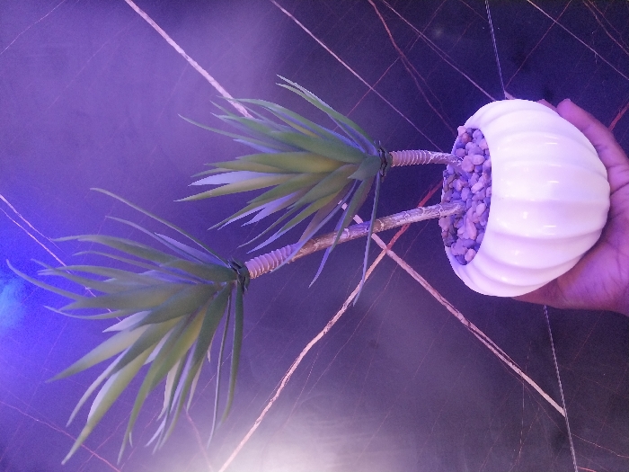 A dark-skinned human hand is depicted holding a small, white, fluted ceramic pot containing an artificial plant. The plant comprises two light-colored, textured stalks, each topped with a rosette of numerous long, slender, pointed green leaves. Dark bands are visible securing the leaves to the upper part of each stalk. The pot's opening is filled with small, irregularly shaped, light purple pebbles surrounding the plant's base. The background is a dark, planar surface, possibly a wall or table, featuring thin, irregular, light-colored linear patterns. The scene is illuminated by intense artificial blue and purple lighting, with a prominent blue light source positioned above or to the upper left, casting a strong hue across the plant's foliage and the upper background. The specific location within the city of Bauchi, Nigeria, is not discernible from the image; the setting appears to be an indoor environment.