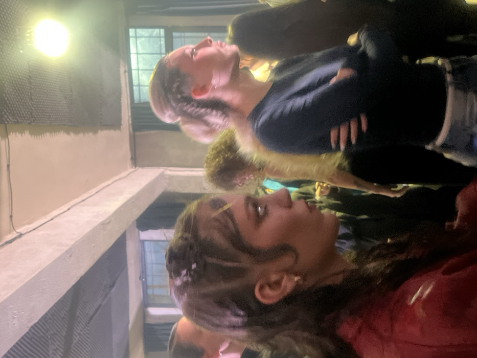 The image depicts an indoor gathering within an industrial-style venue in Sofia, Bulgaria, illuminated by low, warm artificial lighting. The primary subject, positioned in the foreground on the left, is a young female shown in right-facing profile. She has dark hair styled with visible decorative elements, prominent dark eye makeup, and wears a red jacket. A gold hoop earring is visible on her left ear; her mouth is slightly open. To her right and slightly behind, a second young female is also shown in right-facing profile. She has blonde hair styled with braids and a bun, wears a dark long-sleeved top and light-colored jeans, and has her arms crossed over her chest, displaying long, dark fingernails. A silver hoop earring is visible on her left ear. Blurred figures populate the background, indicating a crowd. The overhead structure features exposed concrete beams with visible electrical wiring and sections of corrugated or textured panels. A multi-paned window is discernible in the far background, and a circular, brightly illuminated light fixture is visible in the upper right quadrant of the frame.