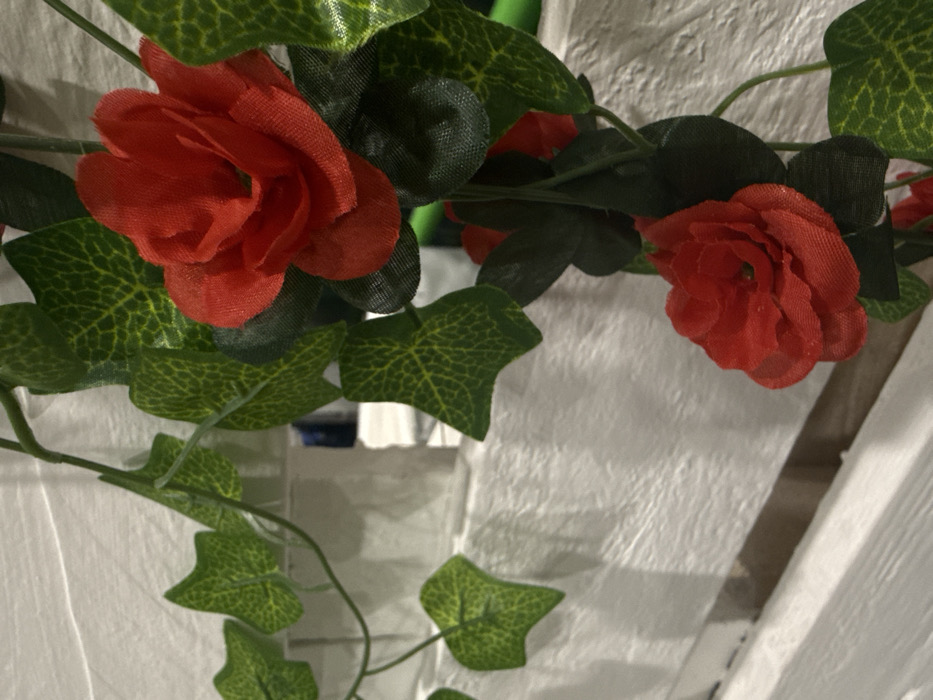 - "The image depicts an artificial vine adorned with multiple vibrant red fabric roses and green ivy leaves, positioned against a white, textured background" by FM-VJm8n1, licensed under CC BY 4.0