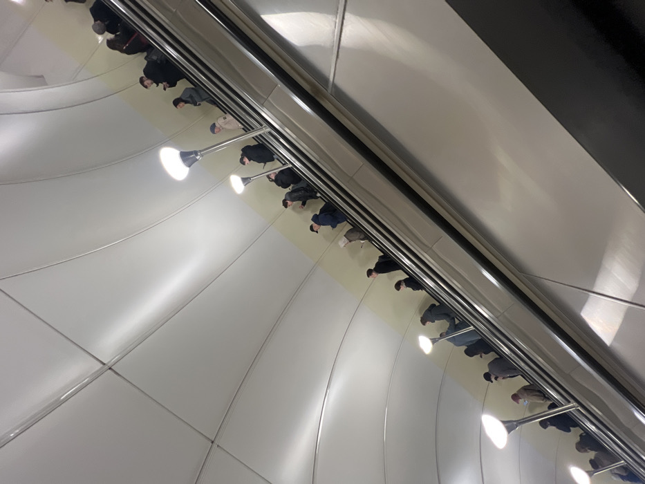 - "An upward-sloping escalator inside the Shushary metro station in Shushary, Russia, is depicted from a low, upward-looking perspective" by FM-4Mf512, licensed under CC BY 4.0