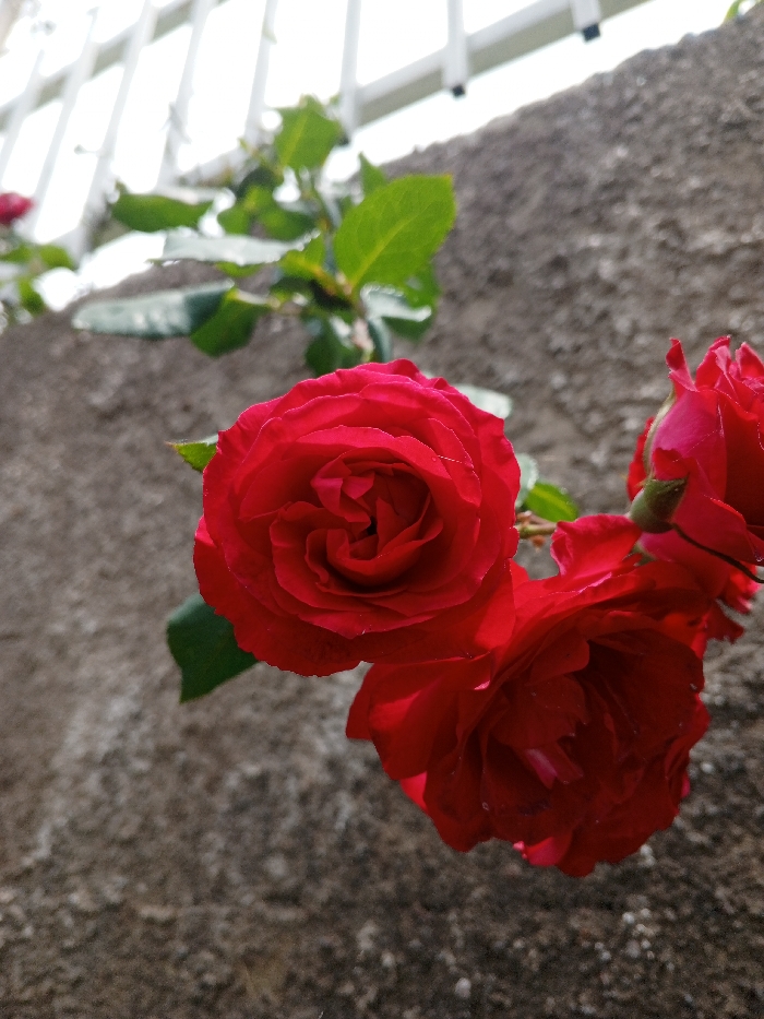The image displays three red roses in an outdoor setting within Calbayog, Philippines. The primary rose, positioned slightly left of center, is a fully bloomed, deep red specimen, exhibiting multiple petals with visible water droplets on their surface. To its lower right, two additional red roses are partially visible and out of focus. Green foliage from the rose plant is discernible behind and around the blooms. The immediate background consists of a rough, grayish-brown concrete or stone wall. Above the wall, a blurred structure of white horizontal and vertical bars, consistent with a metal fence or railing, is visible against a bright, indistinct sky. The scene is illuminated by natural daylight. No individuals or specific interactions are depicted.