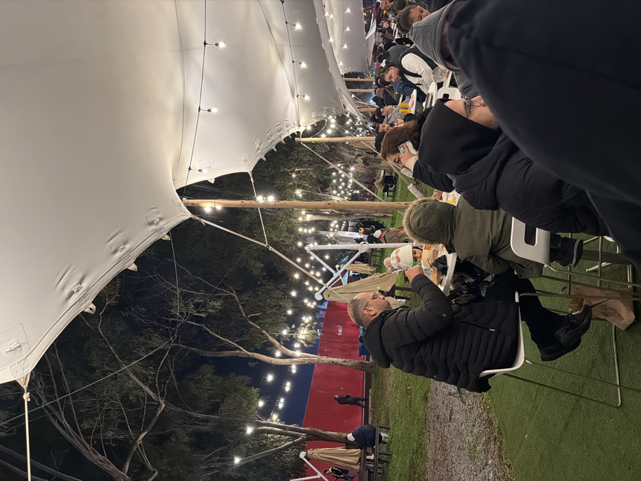 An outdoor evening event is captured under a large white tent adorned with string lights