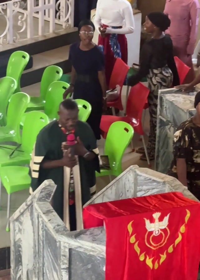 A low-angle shot reveals a group of people singing together in what appears to be a church setting. A man, wearing a black robe with striped bands, stands in a stone pulpit, hands clasped in front of him. A red cloth, adorned with a white dove and flame design, is draped over the pulpit. A group of women is gathered behind the pulpit, each holding a microphone and singing. They are dressed in various colors and styles of clothing, and some are wearing head coverings. Several green plastic chairs are visible in the foreground, and more people can be seen in the background. The camera pans slightly to the right, showing more members of the group, including a woman in a white dress and a man in a white shirt who is also singing into a microphone. The overall atmosphere seems to be devotional and celebratory.