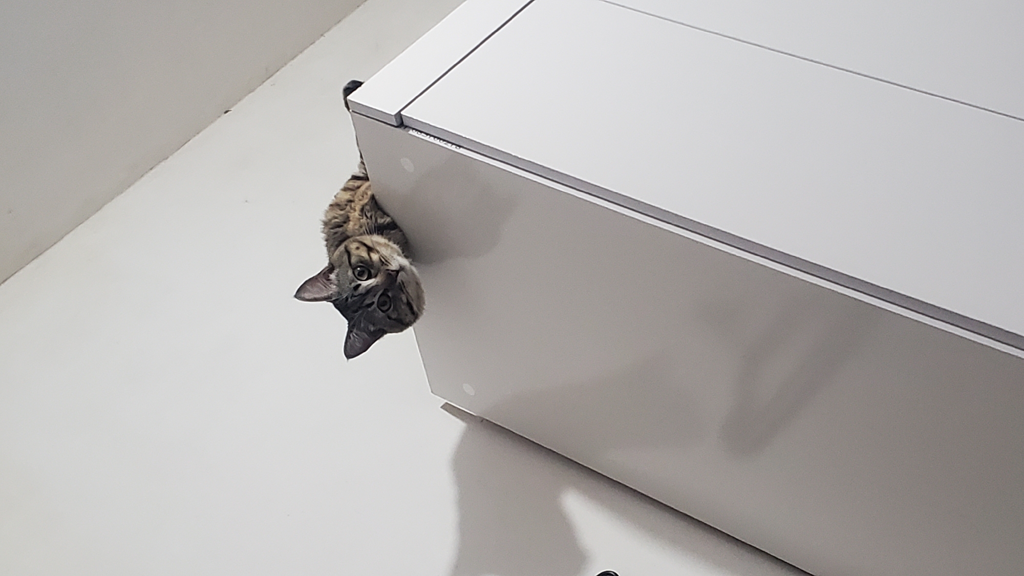 A single, upside-down, brown tabby cat is visible, peering over the edge of a white cabinet