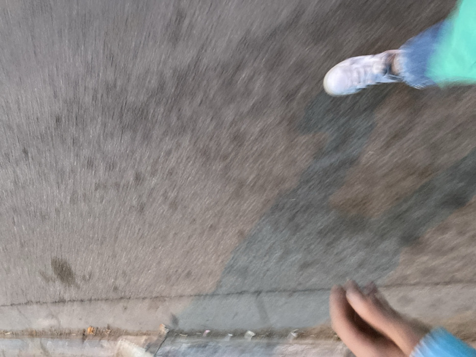 A blurry overhead shot captures the movement of feet on pavement. The gray concrete fills most of the frame, showing hints of shadow and texture. At the top right, a person's foot clad in a white shoe and light green fabric is caught in motion. Similarly, at the bottom right, a pair of feet with blue fabric move into the scene. The photo's blur suggests a swift, forward trajectory.