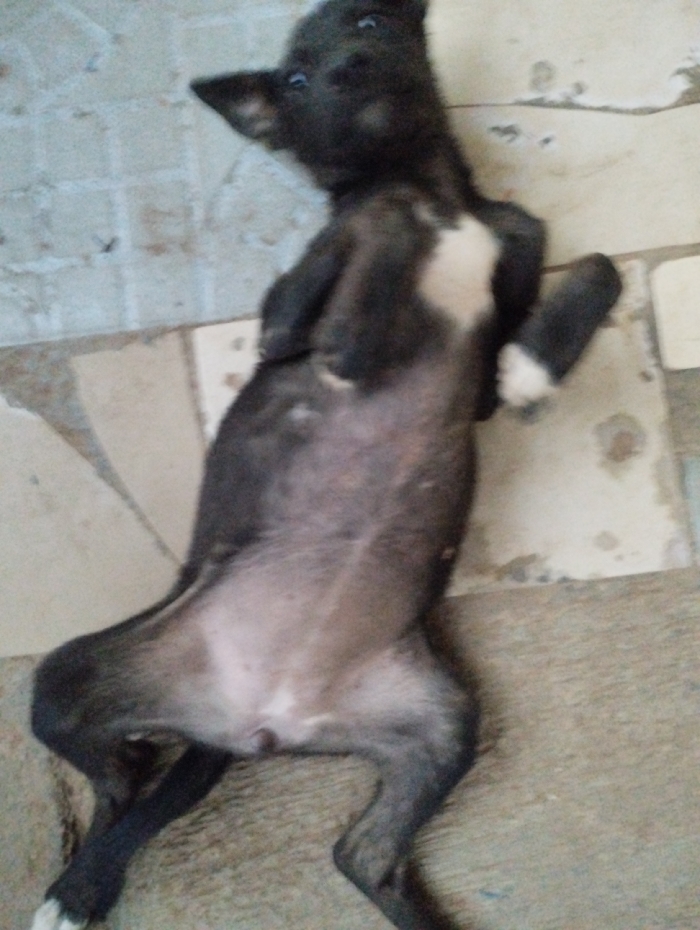 - "A black puppy with a white spot on its chest lies on its back" by FM-P78pk2, licensed under CC BY 4.0