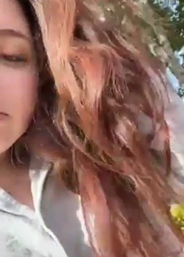 A woman with long, auburn hair stands outside on a sunny day, facing the camera with a slight downward gaze. She wears a light-colored button-down shirt or jacket. Her hair is loose and slightly windswept, and she runs her fingers through it. A tree with light-colored bark is visible in the background, with glimpses of the sky. The scene appears to be a casual, possibly personal, recording.
