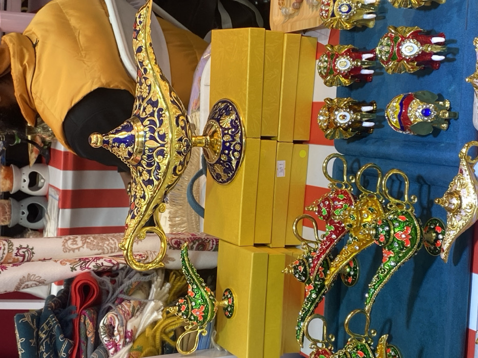 The scene captures a retail display of ornamental objects in an indoor setting within Haidian District, China. The foreground features multiple small, gold-colored metal "Aladdin's lamps" and several small elephant figurines, each adorned with colorful enamel (green, red, gold, blue, white) and embedded jewels. These items are presented on a dark blue fabric surface. In the mid-ground, a larger, prominent gold-colored "Aladdin's lamp" with blue enamel and gold filigree detailing rests on a pedestal, which is positioned on a stack of bright yellow rectangular gift boxes. One box bears a label marked "769 1". The background shows a partial view of a person's upper torso and back, dressed in a yellow puffer jacket over a dark shirt. To the left, stacks of folded and rolled textiles in various colors and patterns are visible. Two white, heart-shaped ceramic diffusers or burners are situated on a shelf behind the textiles. The display table is covered with a red and white striped fabric. The environment is brightly lit.