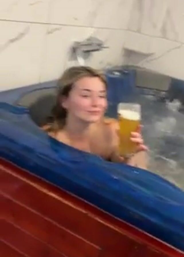In a bathroom with white marble tile walls, a woman sits in a blue hot tub that has a red wood trim. She wears minimal clothing, has wet blonde hair, and is smiling while holding a glass of beer. She takes a large drink, makes a kissing face, and shakes her head. The hot tub is filled with bubbling water.