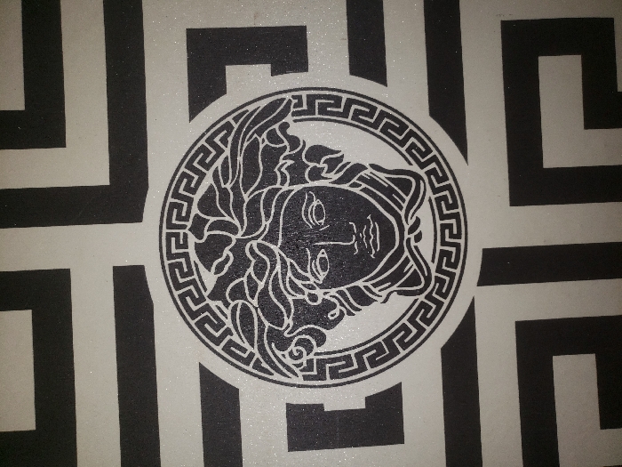 The image displays a static monochrome graphic pattern, not depicting any specific location within Okpanam, Nigeria. Centrally positioned is a circular emblem, approximately 75% of the image width, featuring a stylized depiction of Medusa's head in black outline against a white interior, framed by a concentric black Greek key border. This emblem is superimposed on a background pattern of repeating black Greek key motifs against a white field. The entire surface exhibits a subtle, uniform glitter, suggesting a textured material or finish. No individuals, actions, or interactive elements are present.