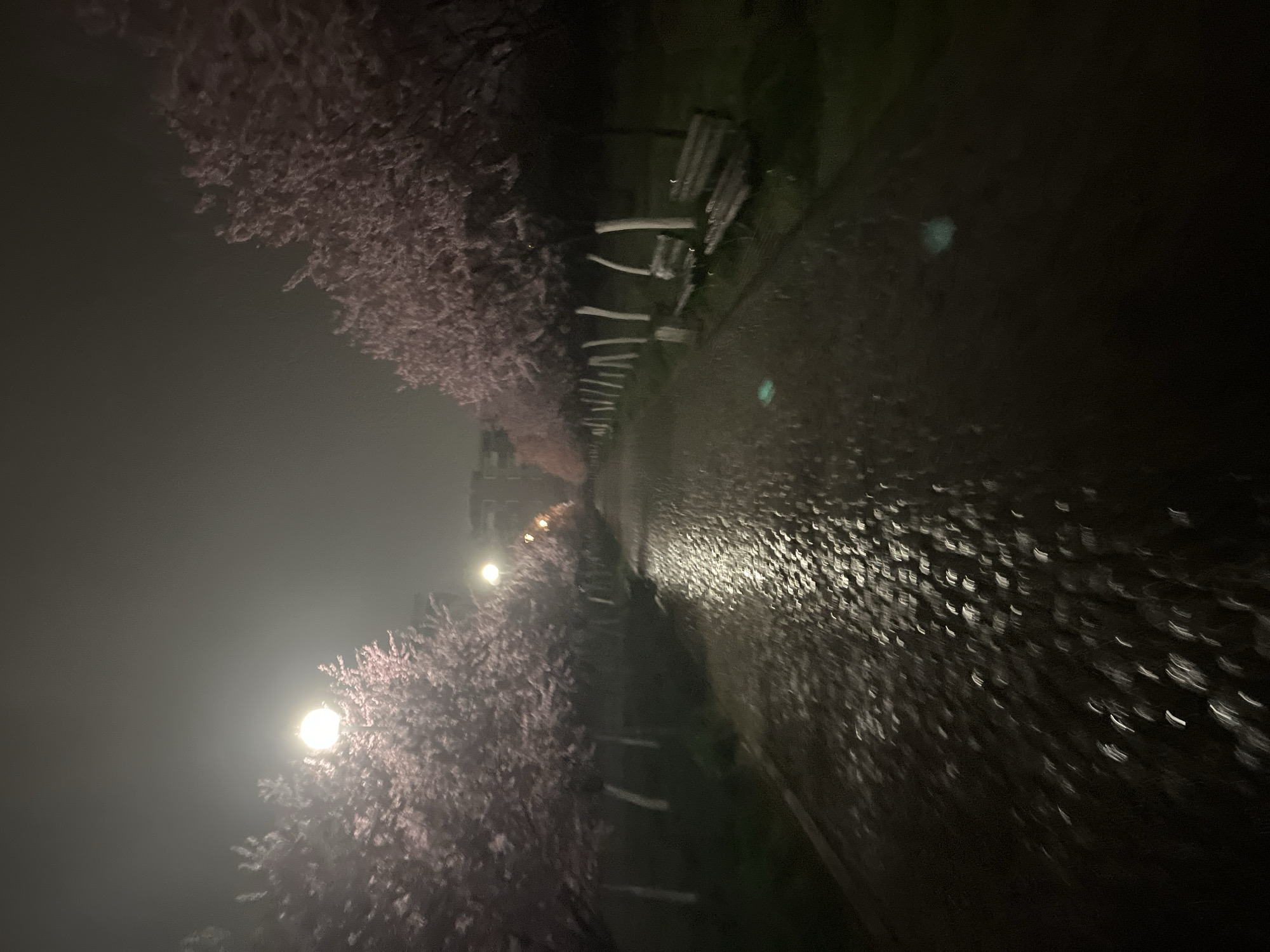 The image presents a nighttime scene of an illuminated park pathway or urban promenade in Plovdiv, Bulgaria. A dark, wet, cobblestone-like path extends from the foreground into the distance, reflecting light sources. On both sides of the path, rows of trees with dense pink blossoms line the route. Multiple spherical streetlights cast bright, white-yellow light, illuminating sections of the path and the tree canopy; one prominent light is visible in the upper left, another further down the path. On the right side, several dark wooden park benches are situated along the treeline. The background beyond the trees is obscured by darkness and a perceptible haze or mist, through which indistinct outlines of buildings are faintly discernible. No individuals, actions, or interactions are present in the frame.