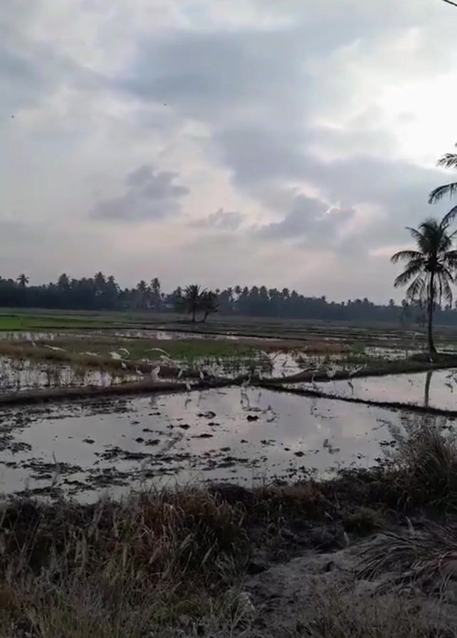 flooded rice paddy field under a cloudy sky. A line of palm trees sits on the horizon. The water is still and reflects the sky. There are multiple white birds scattered throughout the field. In the foreground, there is a patch of brown grass. A power line runs overhead. The camera is still and the video appears to be handheld. The sky is overcast and the light is diffused. There are no people visible. The only sounds heard are those of a vehicle driving by.