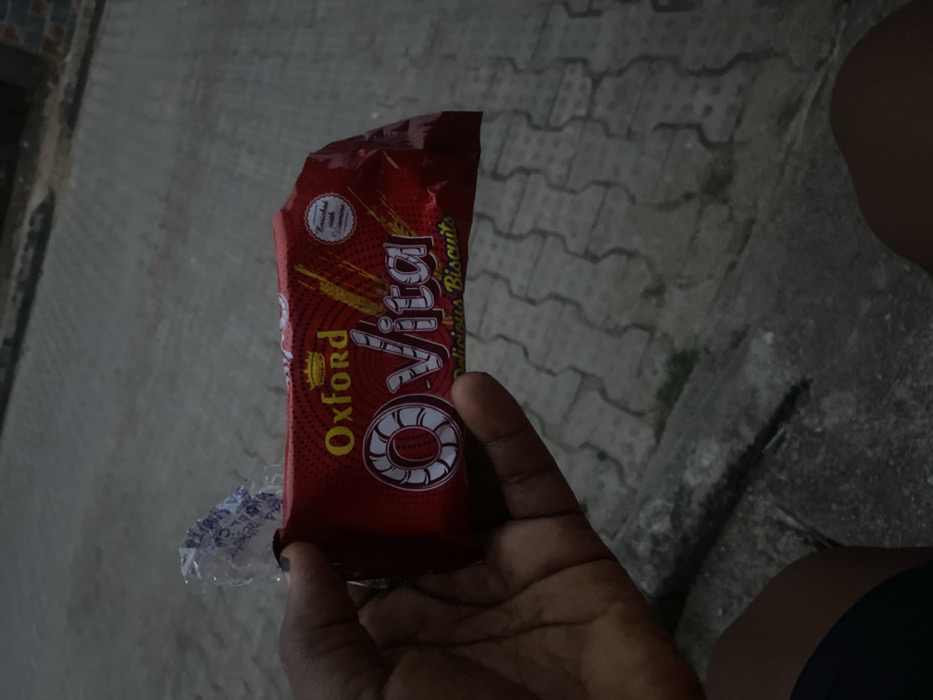 A dark-skinned human hand holds a red packet of "Oxford O Vita Delicious Biscuits," which is partially open at the top left