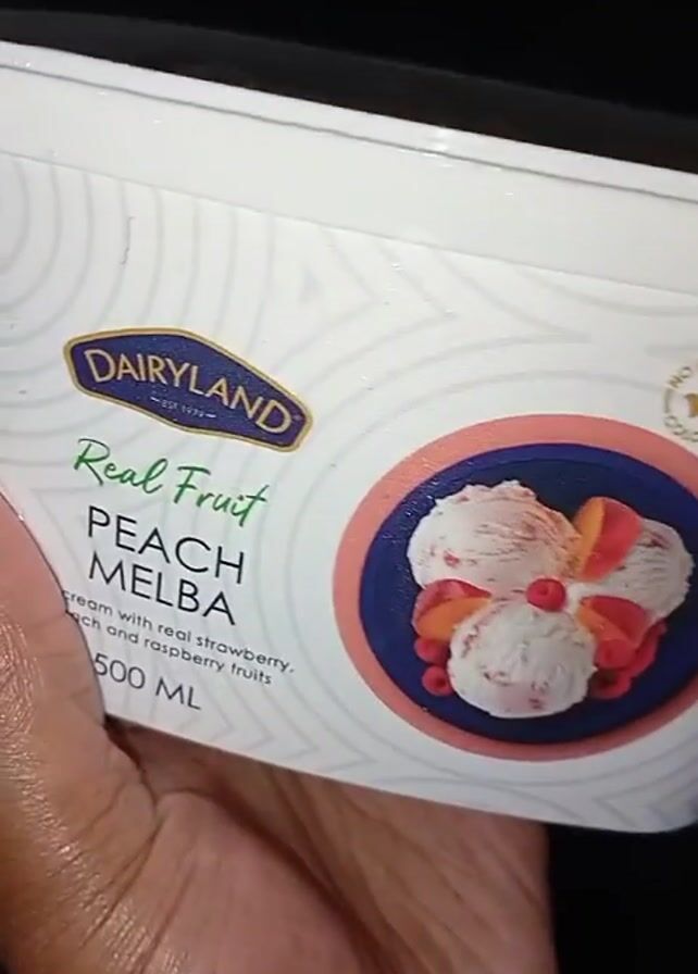 - "person holding a container of Dairyland brand "Real Fruit Peach Melba" ice cream" by FM-FCCQg2, licensed under CC BY 4.0