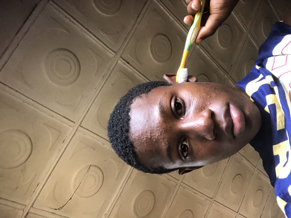 An indoor scene captured in Ukwu-Abwa, Nigeria, depicts a young individual, likely an adolescent male, with dark skin and short, dark, curly hair. The subject is centered in the frame, looking directly towards the camera with a neutral expression. Their skin exhibits some visible blemishes on the forehead and cheeks. A blue garment with white and yellow patterned designs is visible on their torso. The subject's right hand, positioned to the lower right of the frame, holds a toothbrush with a yellow and green handle and white bristles. The bristles are placed against the individual's right ear. The background consists of a light-colored ceiling with a repeating embossed pattern of squares, each containing concentric circles. A distinct crack is visible in one of the upper left ceiling panels.