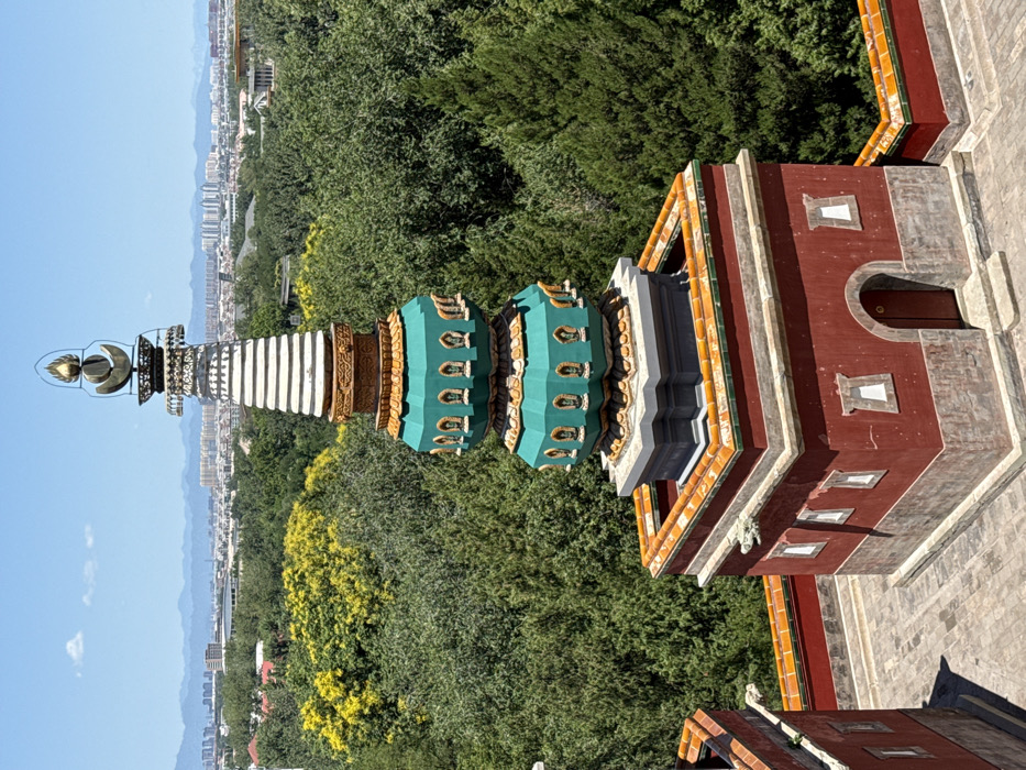 white pagoda with green ornamental tiers, topped with metalwork, rising above dense trees. In the background, a cityscape fades into the horizon under a blue sky. A red and gray building with multiple small windows stands adjacent to the pagoda, contrasting with the surrounding greenery. The perspective is from a slightly elevated viewpoint.